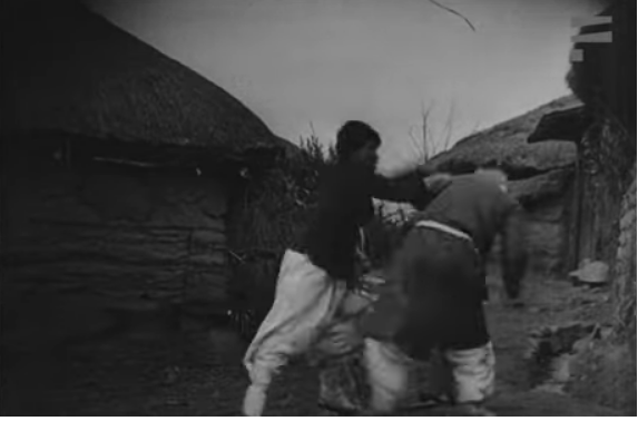 이 장면은 김원보(존칭 생략)가 박순봉(상대역)의 멱살을 왼손으로 틀어잡고 밀고 당기는 것을 보여주고 있다.