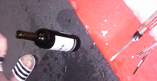이 작가와 저는 모텔 정문 앞에서 일자 드라이버를 사용해 뚜껑 공략에 착수했습니다. 좌우 모서리를 동그랗게 쪼아가기 시작했죠. 하지만 뚜껑은 꿈쩍도 하지 않았습니다. 좀 더 큰 일자 드라이버를 넣어 봤지만, 절대 열리지 않았습니다. 계속 찔렀습니다. 그때 무언가 소리가 들리기 시작했습니다. “사각, 사각.” 뚜껑이 조금씩 열리고 있다는 신호음이었습니다. 그런데 동시에 어떤 가루가 내려앉고 있다는 것을 감지할 수 있었죠. 바로 병의 뚜껑 주위가 드라이버에 갈리면서 파편이 생기는 소리였던 것입니다. 이것으로 저희는 큰 드라이버로는 불가능하다는 것을 알았습니다. 작은 것으로 도전해야했죠. 힘을 냈습니다. 유리 파편이 조금 떨어지기는 했지만 아직 먹을 수는 있었으니까요.작은 일자드라이버가 뚜껑을 공략하기 시작하자 조금씩 움직임이 보이기 시작했습니다. 저희는 환호성을 질렀습니다. 고대하던 뚜껑이 드디어 열리기 시작했으니까요. 이번엔 가운데를 더 찔렀습니다. 그런데 잠시 뒤후 “뽕!”하는 소리가 났습니다. 뚜껑은 없었습니다. 대신 끔찍한 일이 벌어졌습니다. 와인 속으로 뚜껑이 퐁당, 빠져버린 것입니다. 동시에 난도질을 당한 뚜껑의 조각과 와인 입구의 유리파편들이 쏟아졌습니다. 이 작가와 저는 아연실색했습니다. 참 허무했습니다. 씁쓸한 마음으로 차마 버릴 수는 없어서 방으로 와인병을 들고 들어갔습니다. 결국 저희는 알 수 없는 이물질로 가득차 버린 와인을 바라보며 잠을 청했습니다.