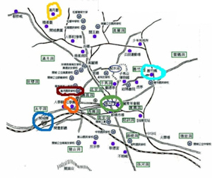 파란색은 2002년 작고하신 오진환 할아버지께서 개성역에 근무하실 때 명성황후 조카 민완식 선생을 뵌 곳이다. 초록색은 개성의 남대문인데, 송창렬 옹의 스승이신 천일룡 선생께서 사시던 남문통에 있었다.