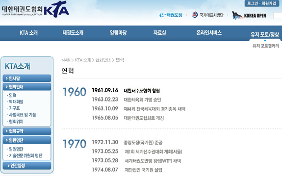 대한태권도협회 홈페이지에 안내되어 있는 연혁