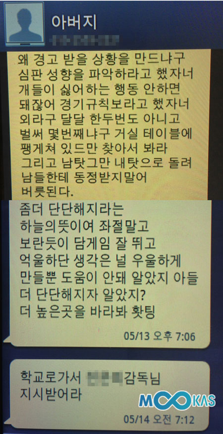 전 관장은 이 문자를 보내고 마음이 편치 않았는지 곧이어 “좀 더 단단해지라는 하늘의 뜻이여. 좌절 말고 보란 듯이 담게임 잘 뛰고 억울하단 생각은 널 우울하게 만들뿐 도움이 안 돼. 알았지? 아들 더 단단해지자 알았지? 더 높은 곳을 바라봐 홧팅”의 문자로 격려했다.