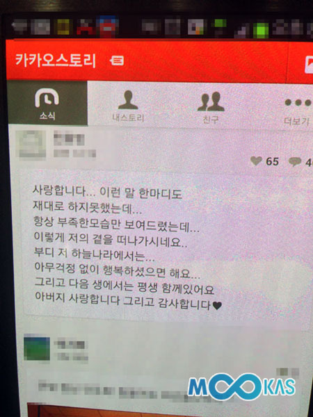 아들은 당시 아버지의 문자에 별도의 답을 하지 않았다. 그런데 갑작스럽게 아버지가 세상을 떠나자 뒤늦게 “사랑합니다. 이런 말 한마디도 제대로 하지 못했는데, 항상 부족한 모습만 보여드렸는데, 이렇게 저의 곁을 떠나가시네요. 부디 저 하늘나라에서는 아무걱정 없이 행복하셨으면 해요. 그리고 다음 생에서는 평생 함께 있어요. 아버지 사랑합니다. 그리고 감사합니다”라고 하늘나라에 있을 아버지에게 편지를 보냈다.