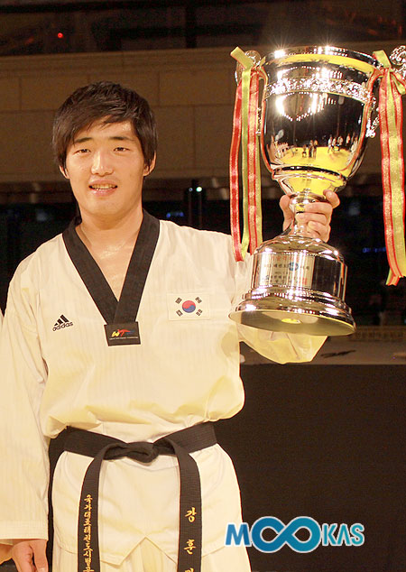 강훈직(세한대)이 세 번째 격파왕 트로피를 들어 올리고 있다.