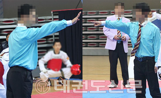 주심이 주의 선언(왼쪽)과 경고 선언 장면. [사진=태권도신문]
