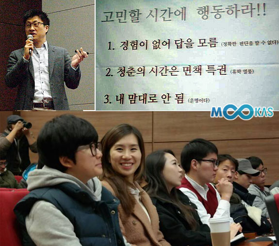 이 대표는 강연의 주제와 별도로 방청객들의 주된 관심사인 취업생의 고민을 여러 유형으로 먼저 늘어놓았다. 이미 이 대표가 대학시절 겪은 고민과 이들의 고민이 다르지 않음을 확인했다. 곧이어 이 대표는 고민은 여러 경험을 가진 자만이 판단할 수 있으므로 우연히 찾아온 기회를 놓치지 말고, 고민할 시간에 행동하라고 조언했다.