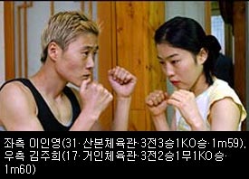 한국권투위원회가 주관하는 예선전을 거쳐 결승에 오른 선수는 나란히 2전2승을 기록한 플라이급(50.8㎏)의 김주희(17·거인체육관·3전2승1무1KO승·1m60)와 이인영(31·산본체육관·3전3승1KO승·1m59). 영등포여고 2년생 김주희는 스트레이트를 주무기로 하는 정통파. 초등학교부터 중학교 1학년 때까지 중장거리 육상 선수로 활약했고 중학교 1학기 때 학급 부반장을 지낸 모범생 김주희는 학교 매점에서 아르바이트를 하고, 취약 과목인 수학을 학원에서 보충하는 틈틈이 복싱을 해서 2년간 닦은 기량으로 치른 지난 2001년 6월의 프로 데뷔전에서 김주희는 일본 격투기 챔피언 출신 선수와 무승부를 기록했다.
