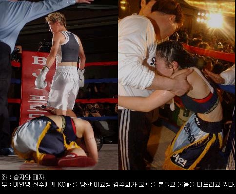 강력한 스트레이트를 갖춘 정통파 여고생 복서냐, 괴력 훅펀치의 전직 트럭운전사냐. 16일 서울 캐피탈호텔에서 벌어진 국내 최초의 여자프로복싱 챔피언전의 승자는 전직 트럭운전사인 이인영 선수의 승리로 끝났다.한국 최고 여전사는 이인영 선수(31. 산본체육관. 4전4승. 2KO. 1m59cm )는 경기초반 적극적인 김주희(17. 거인체육관.4전2승1무1패1ko승. 1m60 )의 공세에 침착하게 밀리지 않고 받아치며 역공을 펼쳐나갔다.