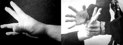 그림 5 좌[합기도의 과학] 106p 진식 태극권 정금우 노사의 장형. 손가락을 쫙 펴지는 않지만 역시 손목 신장력을 살려서 몸힘을 끝까지 쓸 수 있는 형태이다.