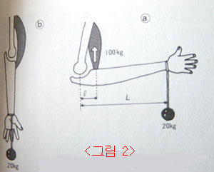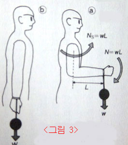 이런 사실들은, 이미 앞 항목에서도 다룬 바 있지만 "근육의 힘과 실제 외부로 발산되어 나온 힘에는 차이가 있다"는 이론에 대한 좋은 예가 될 것이다. 다음에, <그림2>와 같이 똑같은 무게 ω의 물체를 팔꿈치 관절의 각도를 바꿔서 들었을 때, 어깨 관절에 걸리는 부담에 대해 생각해보자(그림3). <그림3>의 (a)와 같이 팔꿈치를 직각으로 구부리면, 이 물체의 무게는 어깨 주위의 모먼트N=ωL을 갖고, 상완을 뒤로 회전시키려고 한다. 이에 대항하여 상완을 연직(鉛直:수평면에 직각을 이루는 방향)으로 유지하려면, 어깨 관절의 근육에 의해 상완을 앞으로 회전시키려는 똑같은 크기의 모먼트 Ns=ωL 을 만들지 않으면 안된다.