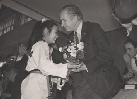 사마란치 전 IOC위원장에게 어린이시범단을 대표해 꽃다발을 전하고 있는 김혜수.