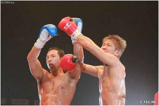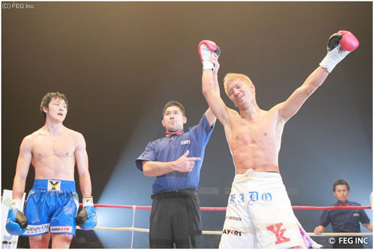 '니가 진정한 맷집왕이다' 임치빈이 야마모토 유야의 손을 들어 승리를 축하하고 있다
