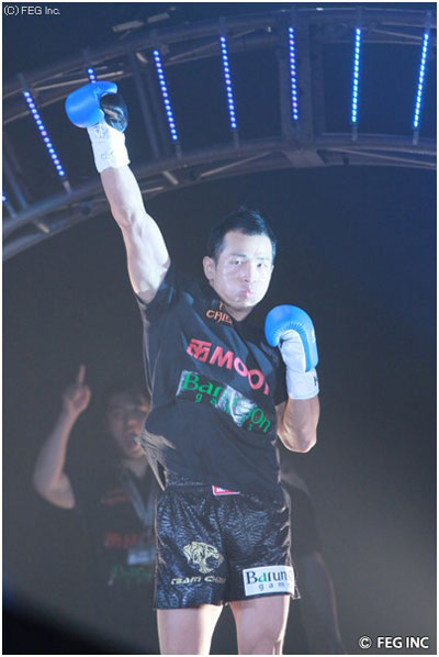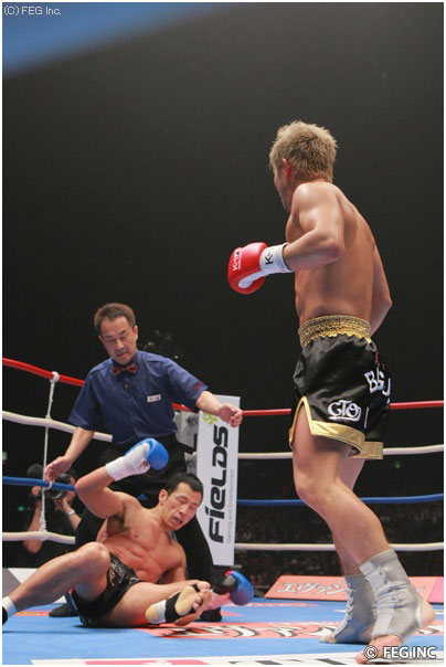 '회심의 백스핀 블로' 야마모토 유야가 임치빈을 KO시킨 백스핀 블로를 날리고 있다