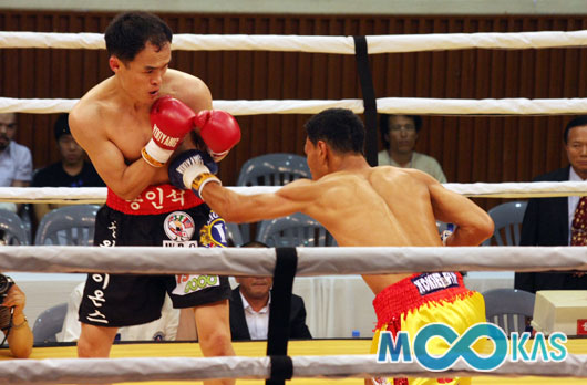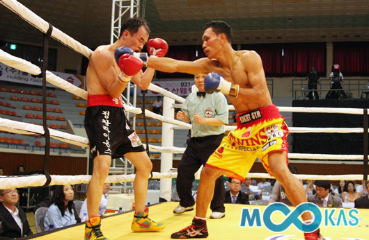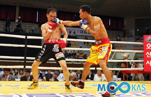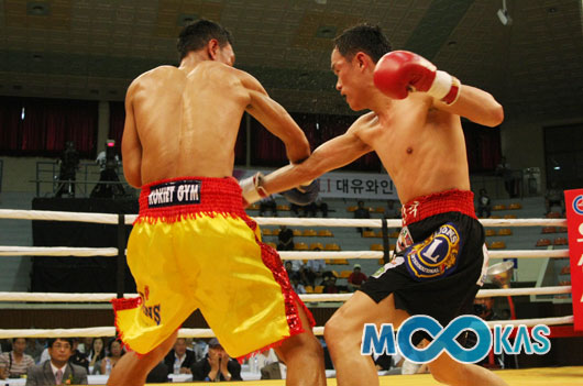 '몸보다 펀치가 빠르다' 라차몽콜이 송인석에 안면에 스트레이트를 적중시키고 있다
