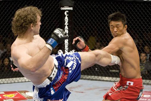 '아우야! 형의 하이킥은 어떠냐?' 추성훈의 하이킥을 간신히 막아내는 밸처
