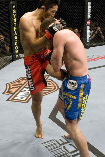 '성훈이형! 나는 타격이 약해요' 김동현이 그랜트의 복부에 니킥을 날리고 있다