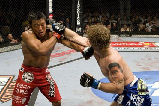 추성훈이 UFC100에서 앨런 벨처를 상대로 경기를 치르고 있다