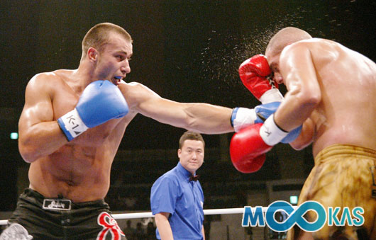 바베르 주리프리오프(왼쪽)가 구칸 사키에게 펀치를 날리고 있다