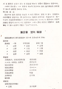 3급 이상부터는 형을 배울 수 있었습니다. 당시 배웠던 형, 지금 태권도로 말하면 품새는 다음과 같습니다. 오키나와 가라테의 형 및 토조산(공격․방어형)․단권(공격․방어형)․장권(공격․방어형)․팔기권(공격․방어형)․태조권․태극권 등을 배웠습니다. 그리고 봉술과 도술의 무기술도 있었습니다. 그 때 배웠던 형들은 지금도 수련하고 있습니다. 당시 배운 순서는 장권, 단권, 팔기권과 태극권(이 두 형은 거의 동시에 배웠다), 토조산, 태조권입니다.